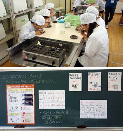 4時間目、家庭科で「お茶の入れ方」の実習をしました。5年生になって初めての調理実習です。ガスコンロの使い方、水と茶葉の量、つぎ分け方などを教わって、いざ実践!