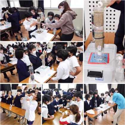 大阪市水道局からスタッフの方に来ていただいて、「出前水道教室」が行われました。10日(水)に1,3組、15日(月)に2,4〜6組と、2日間に分けての体験学習です。