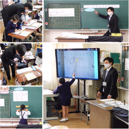5時間目、1年6組で教員対象の参観授業(教員の研修)が行われました。今年度の本校の研究教科である、算数科の授業です。