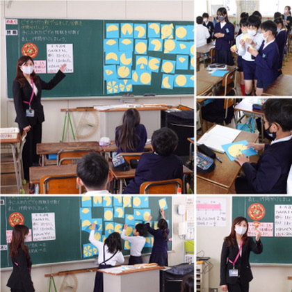 2時間目、算数(習熟度別)の学習。分数の仲間分けをしていました。