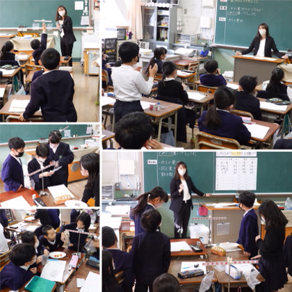 長さや、かさの学習をしたときのことを思い出して、「○○のいくつ分」「○○いくつ分重い」というふうに表すことにしました。「○○」として、1円玉やブロック、ビー玉などが用意されていました。班で実験開始です。
