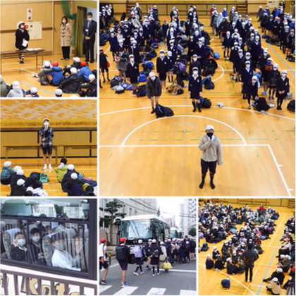 集合時刻は、朝早い7:00だったのですが、頑張りました子どもたち!(保護者の皆様、ご協力ありがとうございました)講堂での出発式後、バス5台で出発です!