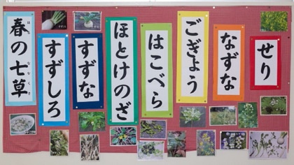 (上の写真は、栄養教諭のM先生制作「春の七草」です。本校ロビーに掲示していますので、見てくださいね。)