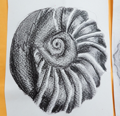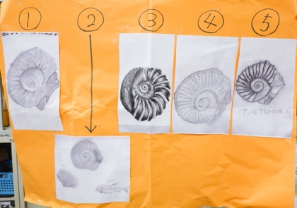 上の写真は、理科「大地のつくりと変化」の授業で、児童が描いた「化石」のデッサンです。前回の「リアルムーン選手権」好評だったので、今回は「化石」に挑戦してもらいました。