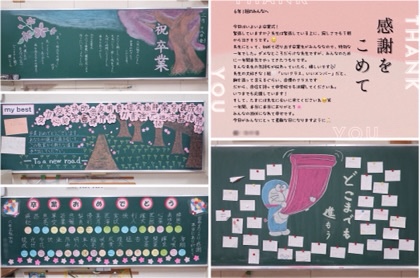 卒業式当日、6年生各教室の黒板(電子黒板)に描かれていた、先生方からの「ラストメッセージ」です。