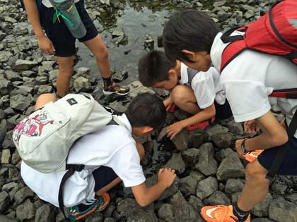 博物館の外でカニを発見した子どもたち。捕獲を試みるも、失敗。残念!