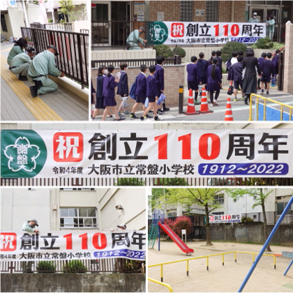18日(月)、管理作業員さんの手によって、本校正門と分校中庭の柵に貼り出されました。常盤公園からもよく見えます。なかなかよいではないか!