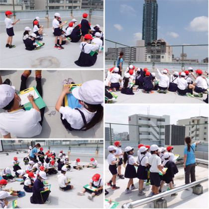 3時間目、3年4組の子どもたちが分校の屋上に上がって、校区のようすを観察しました。社会科の「わたしたちの町のようす」についての学習ですね。
