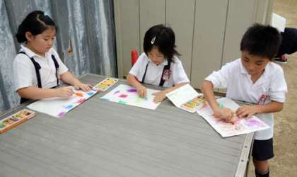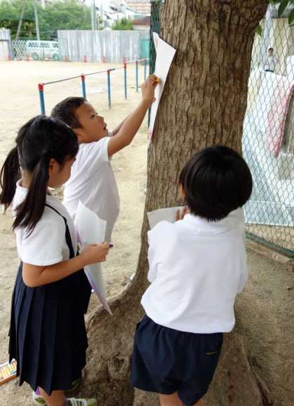 この時期、運動場も空いているときが多いのですが、フッと外を見ると、1年1組の子どもたちが紙とパスを持ってウロウロしていました。