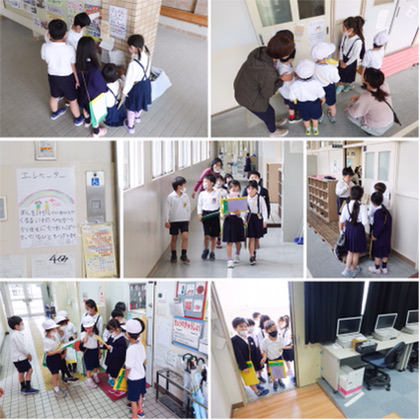 グループごとで、たんけんカードの校舎地図を見ながらの旅。目的地(教室等)には、その場所の解説とクイズが貼り出されていました。もちろん、2年生の手作りです。行く先々で、1年生の子たちに説明する2年生。なかなか頼もしい姿です!