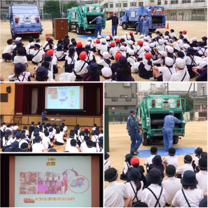 講堂と運動場に分かれて(交代して)の学習です。講堂では、ごみの種類や分別に関するお話を聞きました。センターの方が、映像資料をスクリーンに映しながら、ていねいに説明してくださいました。