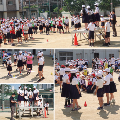 6人前後のグループごとで集合。今回は、集会委員会の司会で「猛獣狩りに行こうよ!」をしました。文字数どおりの人数で集まれたかな? どのグループも、5年生の児童が活動をリードしていました。