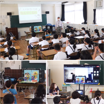 3時間目、5年生を対象に「非行防止・犯罪被害防止教室」が行われました。大阪府中央少年サポートセンターから、2名の職員の方に来ていただきました。5組の児童は多目的室で対面形式、それ以外の学級は、その映像を各学級につないでオンライン形式で行いました。