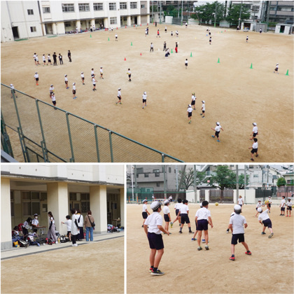 受付(南校舎1階付近)で名簿に名前を書き、ランドセル等の持ち物を置いたら、運動場へ。運動場は、遊びの種類で4つのゾーンに分けられています。(ドッジボール・サッカー・キックベース・その他の遊び)この日は、ドッジボールで遊んでいる子が多かったですね。