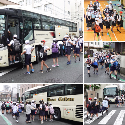 集合時刻は、朝早い7:00だったのですが、時刻までに集合完了。子どもたち頑張りました!(保護者の皆様、ご協力ありがとうございました)講堂での出発式後、予定どおり7:30にバス6台で出発しました!