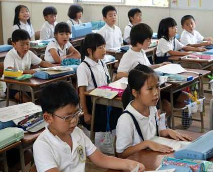 4時間目、6年生の教室へ行こうと階段を上っていると、校歌が聞こえてきました。はつらつとしたさわやかな歌声。どこのクラスかなと思ったら、2年4組! 思わず寄り道してしまいました。