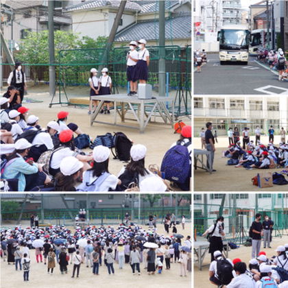 15:50、6台のバスが次々に学校前に到着。帰路スムーズすぎて、2〜5年生の下校時間と、6年生の帰校が重なってしまう事態に。「さようなら」と「おかえり」が交差するお迎えになってしまいました。