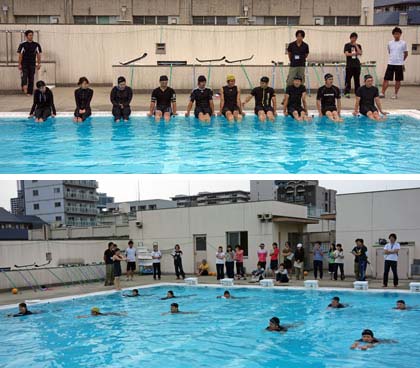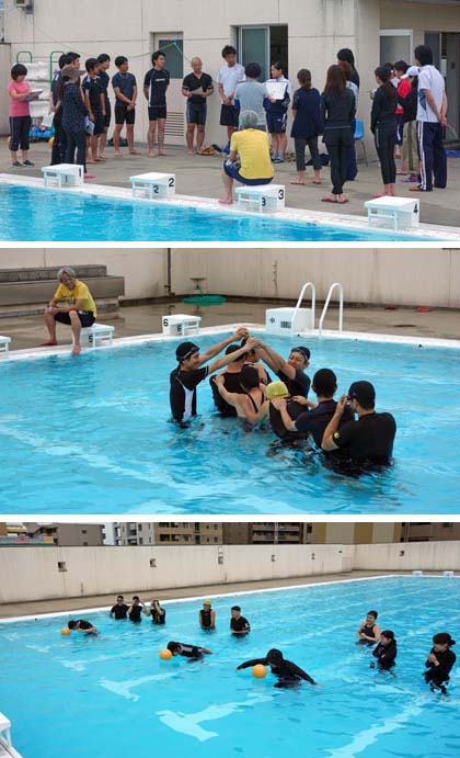 プール開きに先立って、教員対象の水泳研修会が行われました。講師は、2年6組担任のY先生です。