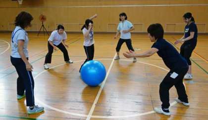 まずは、Gボールを使ったいろいろな運動を教わりました。2人組で体のバランスをとる動き、ゲーム感覚でできる運動、協力して課題をクリアしていくようなもの、などなど。最後にグループでやった“Gボールアタック”は、特に盛り上がりました。「巧みな動きを高めるための運動」で、外野の人がボールを転がして内野の人を当てるというもの。内野の人は、飛んだり跳ねたりもう必死!(上の写真)