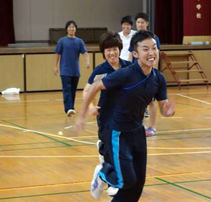 次に、リレーのバトンパスをゲーム感覚で練習する方法を教わりました。後ろを向きながらゆるゆるとリードするのではなく、バトンを渡す方も受け取る方もトップスピードの状態でバトンパスをするためのグループ練習を、実際にやりました。参加した教員が真剣に走る姿、ぜひ見ていただきたかった! 真剣だからこそ起こる珍プレーに、思わず笑顔になった先生方でした。(下の写真)