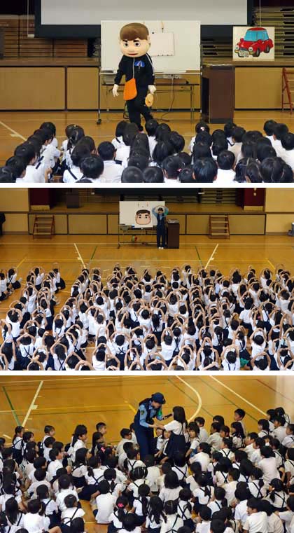 前半は着ぐるみ劇、後半はビデオを見ました。誘拐犯に狙われやすい子、逆に狙われにくい子、犯罪に合わないようにするにはどうすればいいのか等を、女性警察官や着ぐるみのおじさん(犯人役)に教わりながら確認していきました。