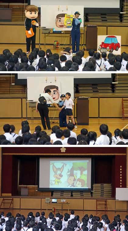 3時間目、防犯教室が行われました。阿倍野警察署の生活安全課の方に、「誘拐被害の防止」と「自分の体や命を守るために、どうすればよいのか。」について、わかりやすく楽しく教えていただきました。