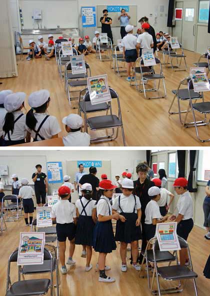 今日の活動は、「英語を使って道案内の会話をする」というものでした。観光客と案内人になって実際に案内する、案内されるということで、広い多目的室での授業でした。