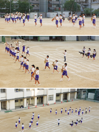 ポジションを確認し、演奏しながら動きやフォーメーションを繰り返し練習していました。部員の中には、常盤小学校の卒業生もいましたが、みんな心身ともにたくましく成長していて、頼もしく見えました。