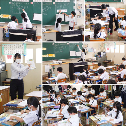 5時間目、算数の学習。1年1組で教育実習中のT先生が、研究授業を行いました。「3つの数の計算」を学ぶ授業です。