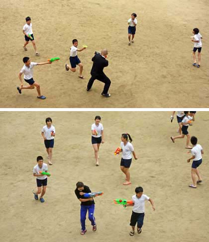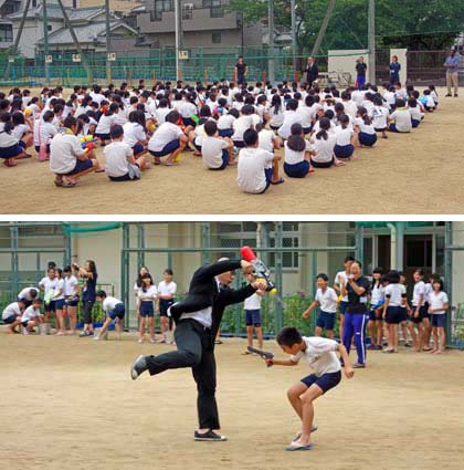 3時間目、6年生・先生方が、色とりどりの水鉄砲を片手に運動場に集合! 学年のお楽しみ会、壮大な“みずあそび”のスタートです!