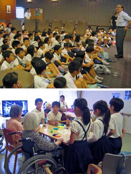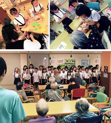 入所者のみなさんは、テーブルに分かれて座っておられました。子どもたちは、班ごとに分かれてそれぞれのテーブルへ。前半は、折り紙やトランプ、あやとりやお手玉をしていっしょに遊びました。教えたり教えられたり、おしゃべりをしながらの時間でした。