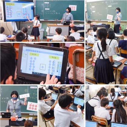 5時間目、算数の学習。タブレット端末(1人1台学習者用端末)を使って、かけ算の式の説明をしていました。