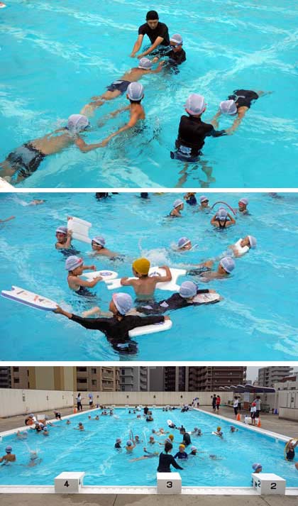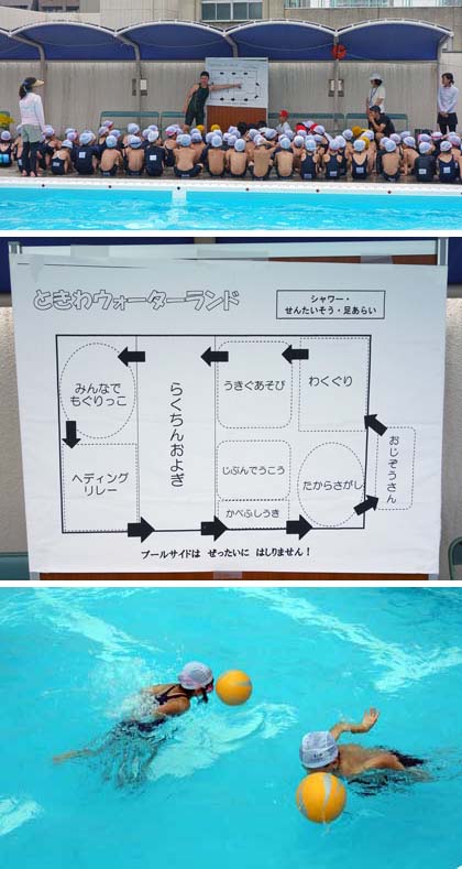 5時間目は、2,3,6組の水泳の時間。ときわウォーターランドがオープンしていました。「たからさがし」「うきぐあそび」「らくちんおよぎ」など、プール・プールサイドに8つのコーナーができていました。