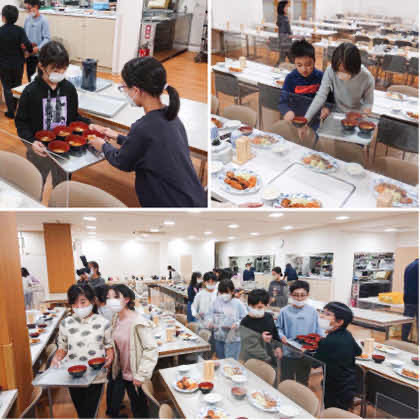 ここは食事係の出番! ひと足早く食堂に集合し、配膳等の準備をします。