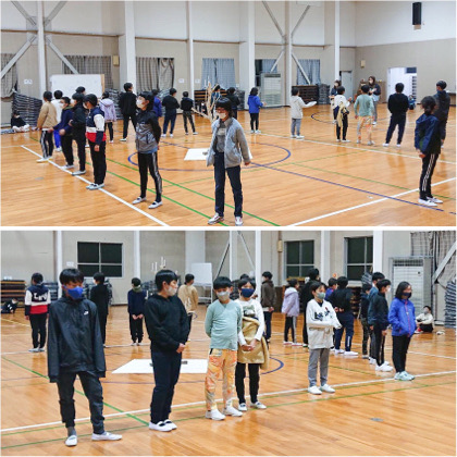 夕食後、体育館に集合したのは、キャンプファイヤー係。本番前最後の練習と打ち合わせです。
