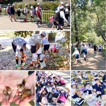 行きは、学年別で行動し、現地で合流。たてわりペア班ごとに集まって、活動開始です。活動をリードするのは、もちろん6年生。どんぐり拾いでは、探して歩く1年生をサポート。いっしょに拾ったり、どんぐりがありそうな場所へ連れて行ったり、迷子にならないように見守ったり。ピューンとすっ飛んでいく1年生を、慌てて追いかける6年生も。(笑)