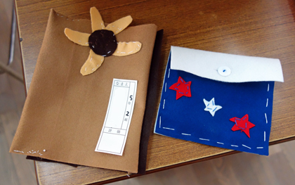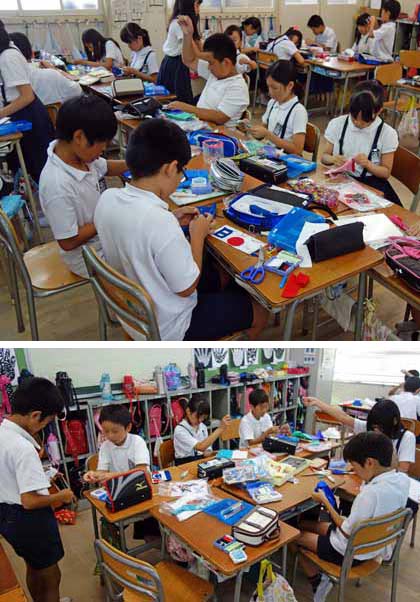作業は仕上げの段階。もうでき上がっていた子でしょうね、友だちのお手伝いをしている子もいました。玉どめ・玉結び、なみ縫い・かがり縫い等、1学期に教わった技はスムーズに使えたかな?