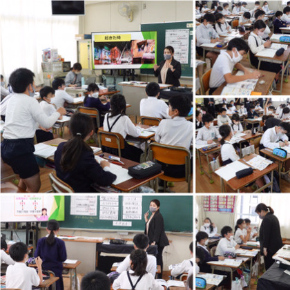 この日の授業は、いつ起こるかわからない地震や津波に対して、国や大阪府、大阪市がどのような取り組みをしているのかを調べ、それは何のためなのか、地震や津波から命とくらしを守るにはどうしたらいいのか考える授業でした。