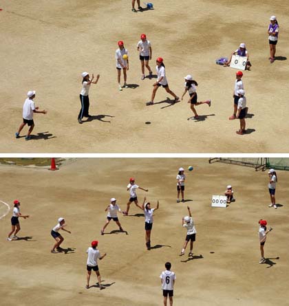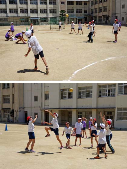 照りつける太陽の下、運動場で思い出づくりハンドボール大会が開かれていました。学級で何をするか話し合ったとき、「5年の体育でやったハンドボールをしたい!」という子が多かったんだそうです。