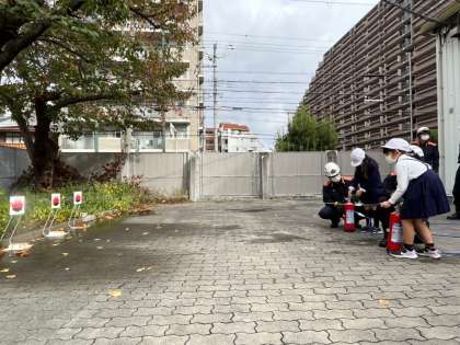 消火体験では、水消火器を使って消火活動を体験しました。子どもたちは、狙いどおり水が噴射でき喜んでいました。