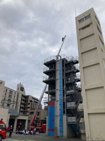特殊車見学では、40mまで伸びるはしご車に先生が乗り、その様子を子どもたちが観察しました。どんどん伸びていくはしごに大歓声!降りてきた先生たちは、「想像以上に高くて怖かった・・・」と言っていました。