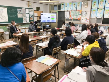 5時間目、2年3組で教員対象の参観授業(教員の研修)が行われました。今年度の本校の研究教科である、社会科(1,2年生は生活科)の授業です。