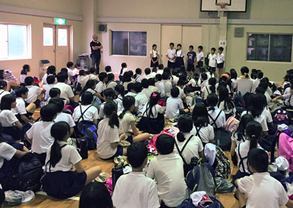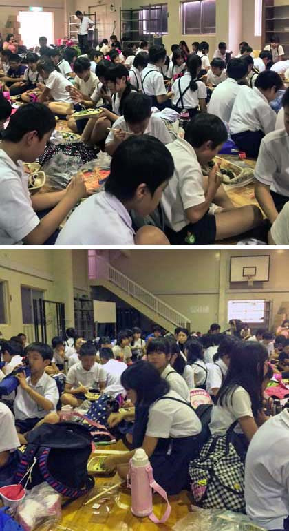 引き続きお弁当タイム。広場ではなく体育館。外はまだ雨…。