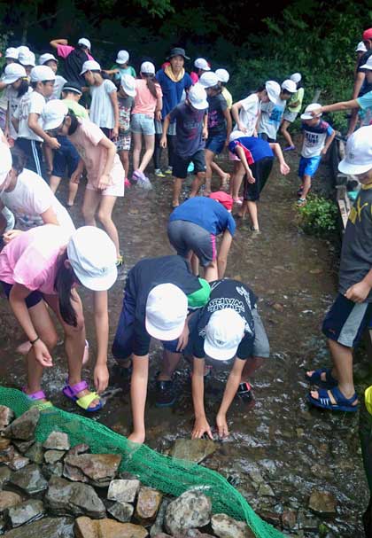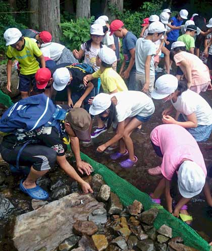 岩の間に頭を突っ込んでいるマスの腹と頭を一気につかめ!