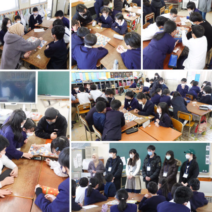 関西外語専門学校の留学生のみなさんとの交流会も、今回が最終回。留学生のみなさんに、昔ながらの日本の遊び「すごろく」を体験してもらいました。5年生の子どもたちが、留学生のみなさんをリードする活動です。