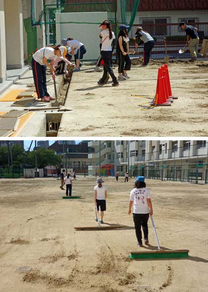 側溝をおおっている重いふたを開けると、かなりの土が。雨水といっしょに流されてきた運動場の土です。シャベルですくい上げ、運動場に戻しました。