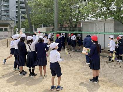 上の写真は、教室で温度計の使い方を学習した後、校庭で気温を測っているところです。