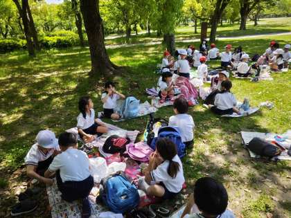 西の丸庭園は、常盤小学校の貸し切りで、クラスごとに鬼ごっこやハンカチ落とし、だるまさんが転んだ、などの遊びをして楽しみました。