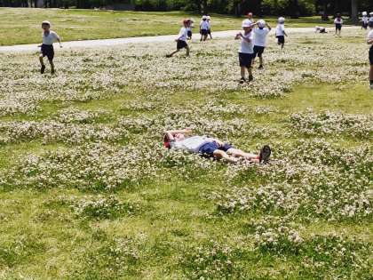 自由遊びの時には、シロツメクサの上に寝転んだり、クルクルと回ってみたり、鬼ごっこをしたり、それぞれが思い思いに遊びました。
