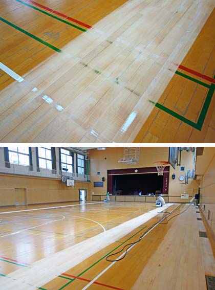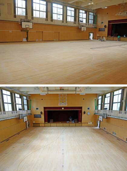 講堂の床の補修工事ですが、いよいよ本格的な作業が始まりました。